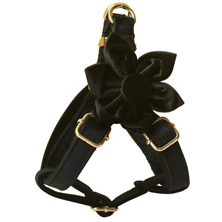 The elegant gold buckle adds a touch of sophistication, complementing the sleek black flannel design. This harness is not just about appearance; it is engineered for function and comfort, making it an excellent addition to your pet's essentials.