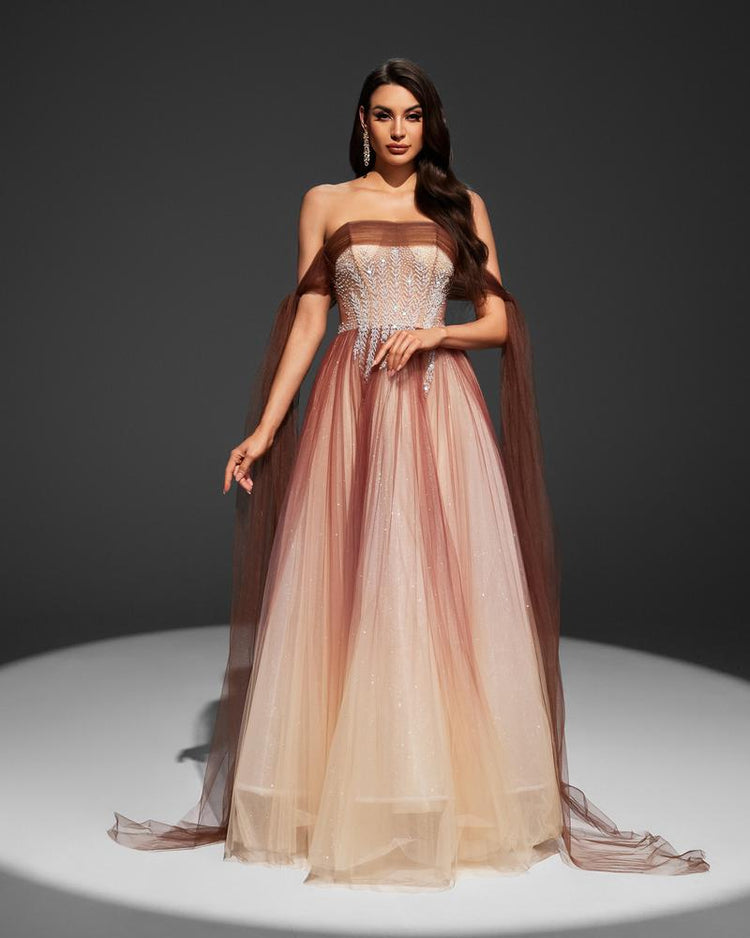 Introducing the JMT-123658 Elegant Brown Evening Gown for Women - Style EZ25017, a stunning addition to any formal wardrobe. This gown is thoughtfully designed to provide elegance and sophistication for various occasions, from galas to evening events.