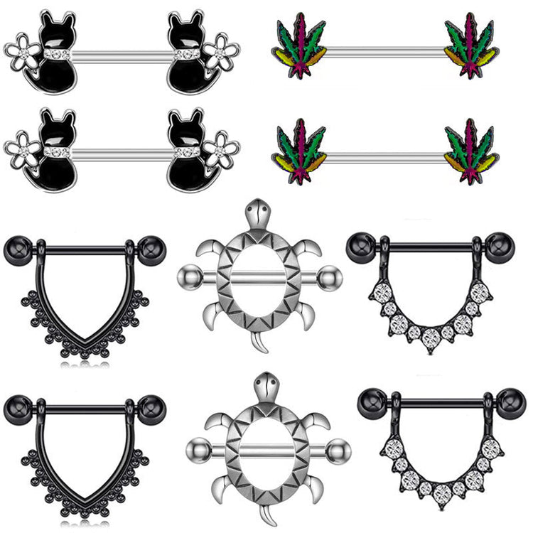 JMT-247114 Cat-Inspired Stainless Steel Nipple Ornaments with Smooth Black Leaves and Diamond Accents