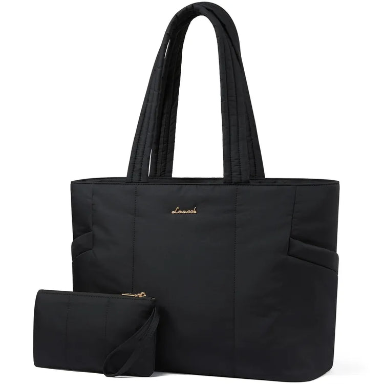 The puffer style adds a modern flair while providing ample padding to protect your laptop and essentials. The tote features a spacious main compartment, allowing you to organize your laptop, chargers, notebooks, and other accessories effortlessly. In addition to the main bag, it comes with a practical clutch purse for smaller items, adding to its versatility.
