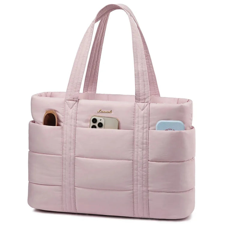 Crafted from lightweight materials, this tote bag is ideal for daily commuting, travel, or school. Its multi-pocket design allows for efficient organization of your laptop and other essentials, ensuring everything you need is easily accessible. The puffer material not only adds a modern touch but also provides protection for your devices against bumps and impacts.